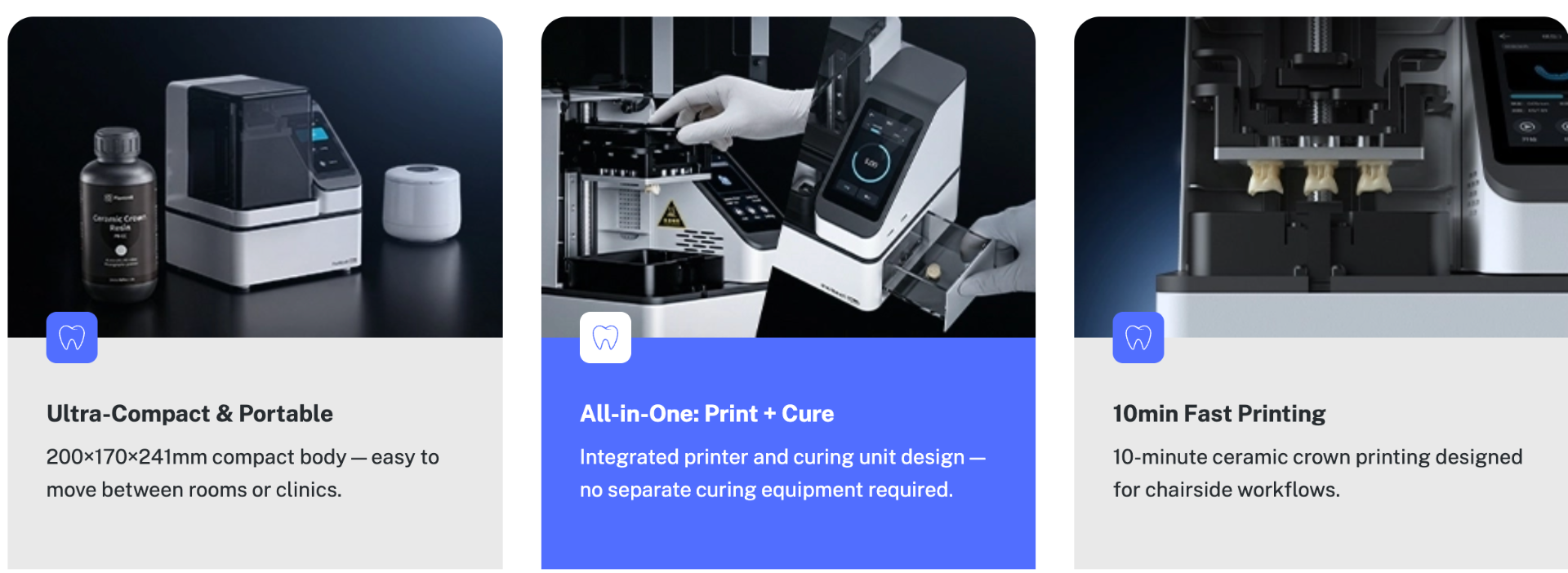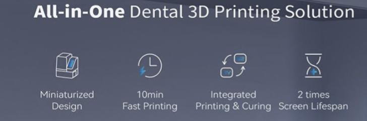 CHAIRSIDE Mini es una solución compacta e integral de impresión 3D dental que combina una impresión rápida y precisa con un curado integrado. Diseñada para ser portátil y de uso diario en la consulta, ofrece una amplia compatibilidad con materiales, resultados consistentes y flujos de trabajo clínicos eficientes.