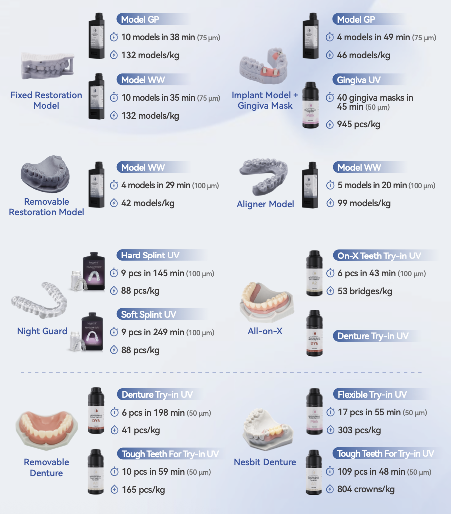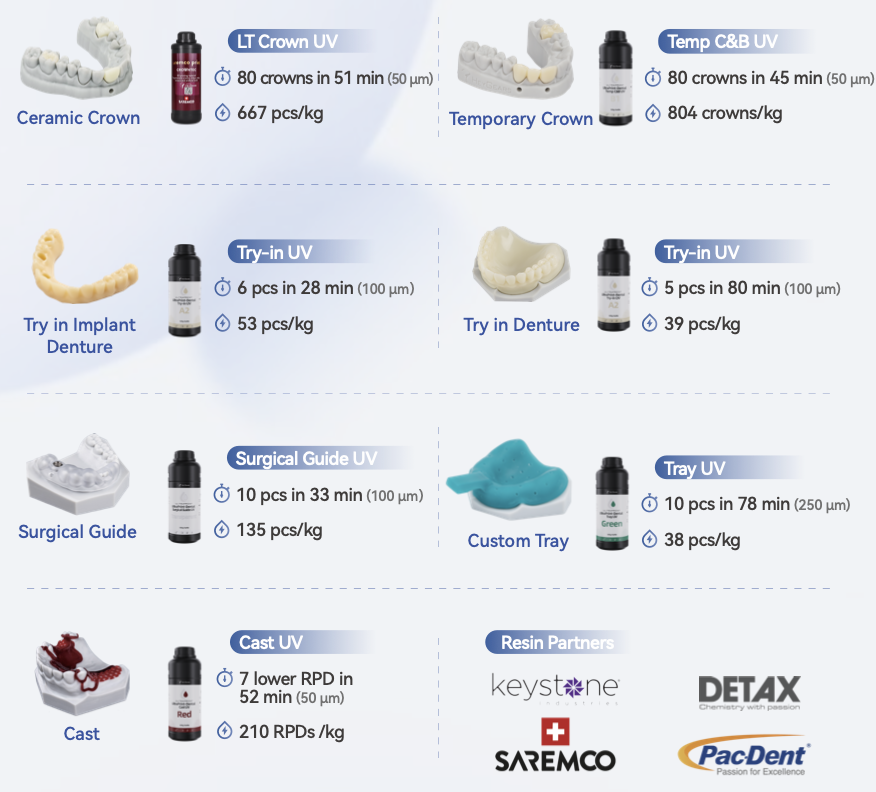 La serie UltraCraft C puede producir más de 50 aplicaciones con más de 10 materiales, como guías quirúrgicas, coronas y puentes provisionales, cubetas de impresión personalizadas y los primeros pasos para modelos de alineadores transparentes. Combínelo con AirWash o AirCure para un flujo de trabajo dental digital completamente personalizado.