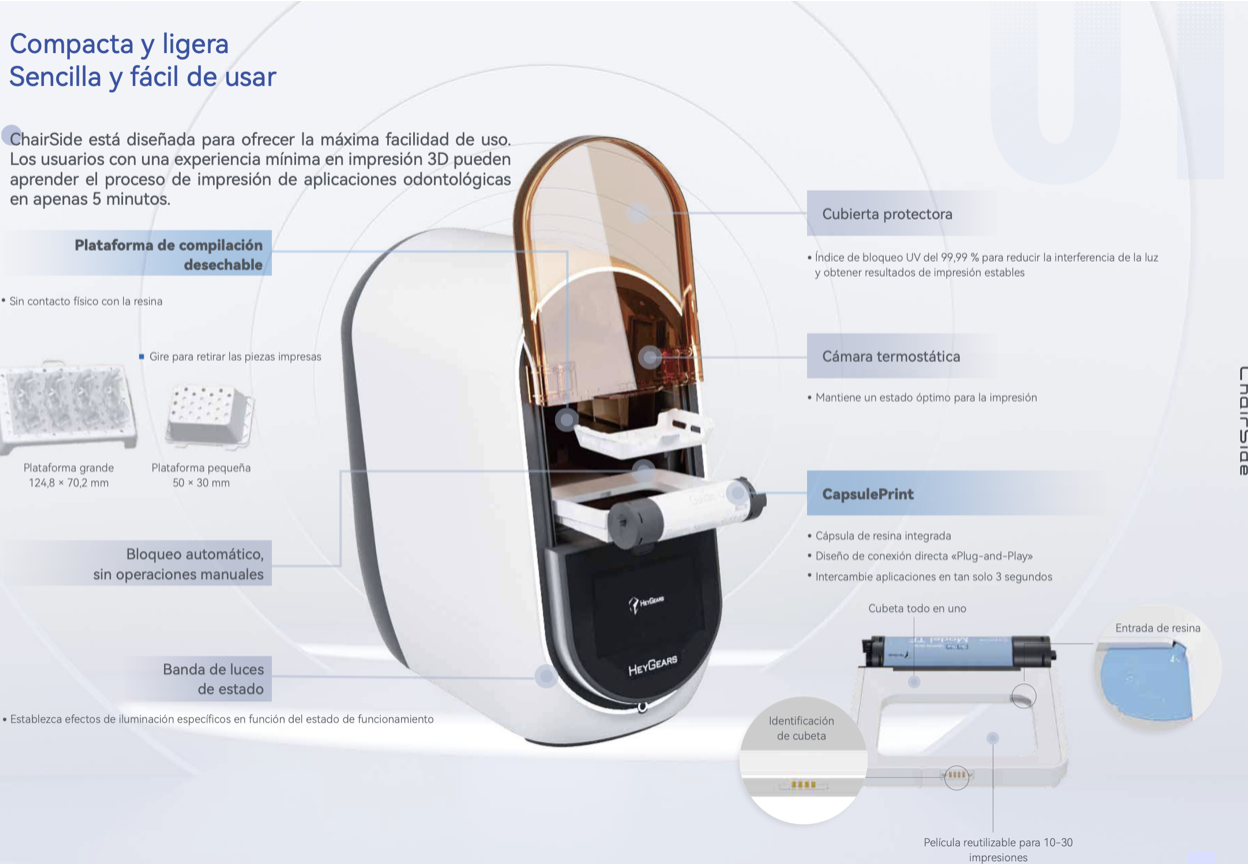 La UltraCraft ChairSide Pro es una impresora 3D de escritorio de grado industrial, diseñada para clínicas o laboratorios con mayor demanda de producción en aplicaciones dentales. Ofrece la misma calidad que la ChairSide, pero a mayor velocidad, lo que la hace ideal para la producción de lotes pequeños.