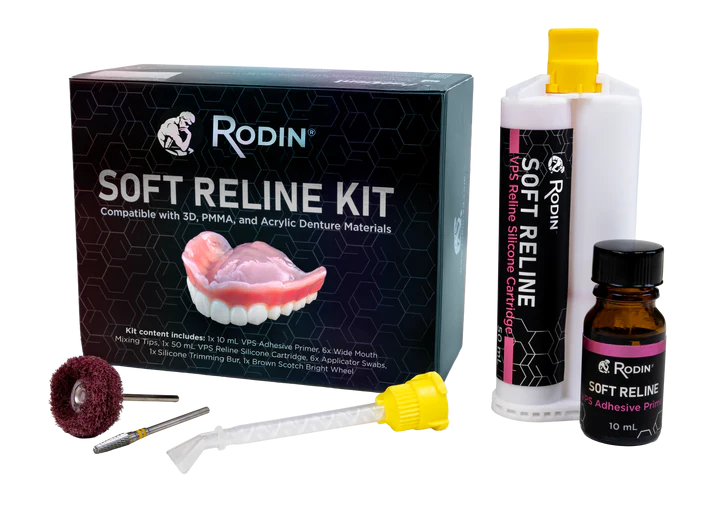Rodin® Soft Reline cuenta con una fórmula exclusiva a base de silicona que mejora el ajuste y optimiza el rendimiento de prótesis dentales completas o parciales, tanto removibles como fijas. Diseñado para una adhesión y resistencia al desgarro superiores, es la solución de rebase ideal para bases de polímero impresas en 3D, así como para materiales acrílicos tradicionales y fresados con PMMA.